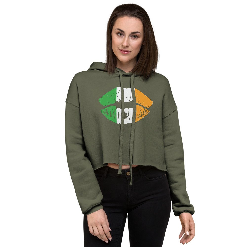 Irish Flag Lips, Pop Art Irish Hoodie, Women’s Crop Hoodie, Sexy Irish Style, Irish Flag Colors, 4 Leaf Clover, St. Patrick’s Day Outfit, Irish Pride, Popart Apparel, Irish Festival Wear, Lucky Lips Hoodie, Irish Crop Hoodie, Clover Hoodie, Bold Irish Fashion, Green Glam