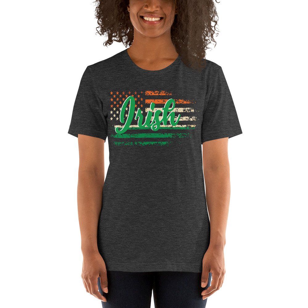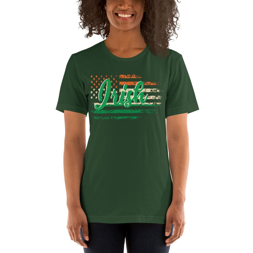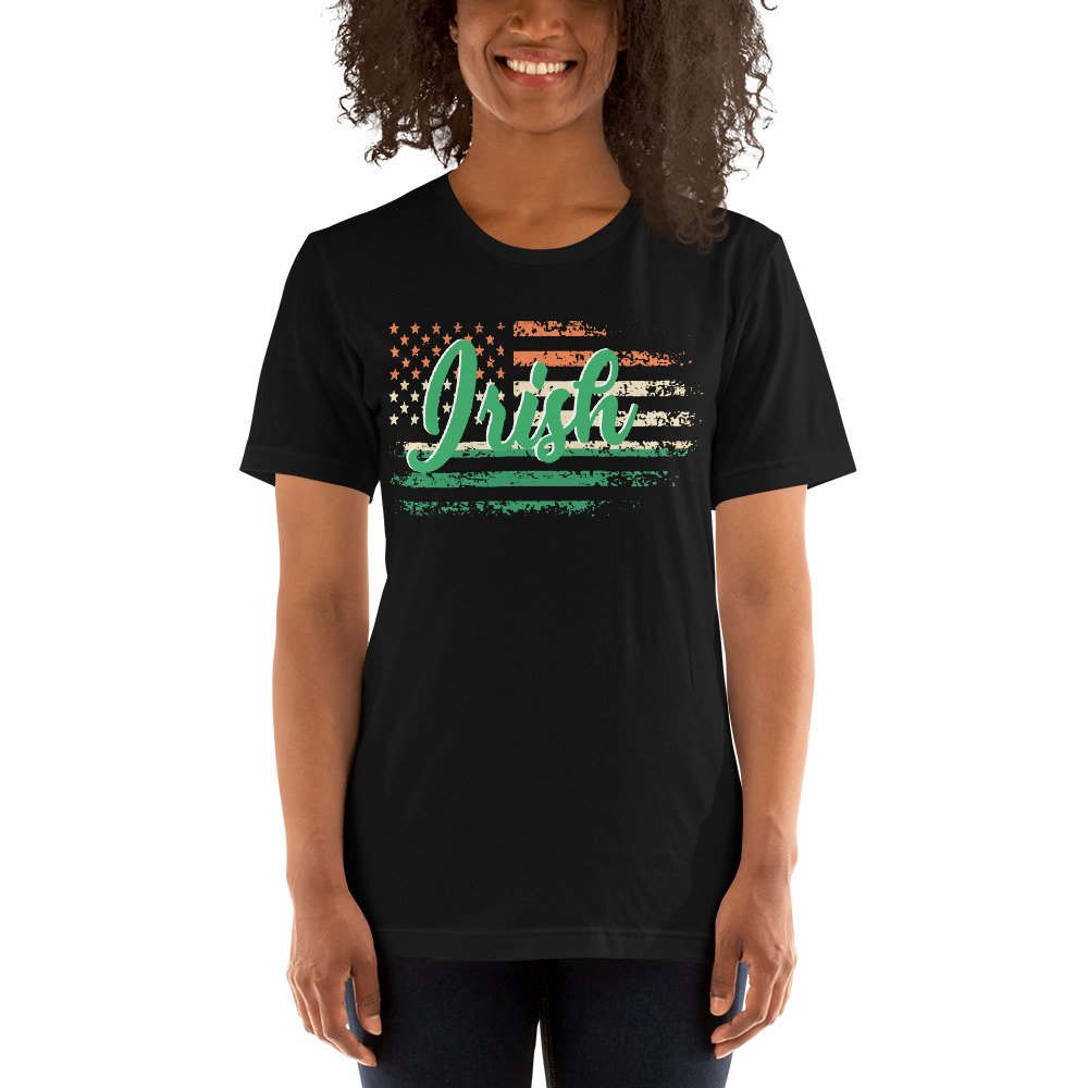 Irish American T-Shirt, Distressed Flag Shirt, Irish Heritage Tee, Unisex Irish Shirt, St. Patrick’s Day Apparel, Irish Flag Colors, Green White Orange Flag, Proud Irish American, Irish Roots Shirt, Celtic Pride Tee, Irish Festival Outfit, Patriotic Irish Gift, American Irish Culture, Irish Pride Shirt, USA and Ireland Flag